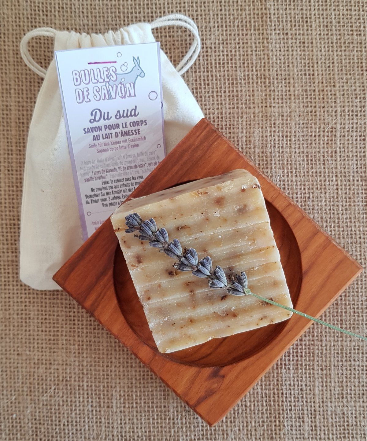 A base de: Huile d'olive*, lait d'ânesse, huile de coco*, hydroxyde de sodium, huile de tournesol, eau, miel*, beurre de karité*, son d'avoine*.